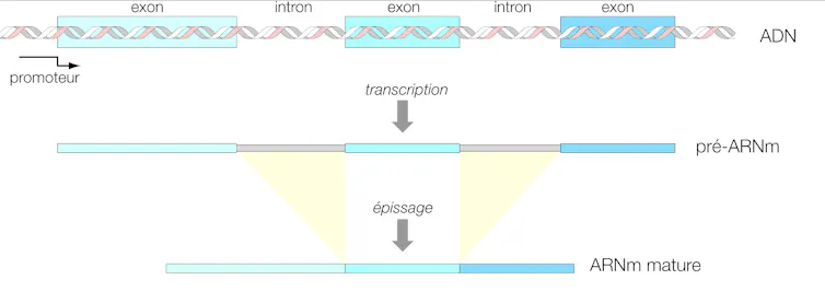 Dans l’étude que nous venons de publier dans Nature Communications, nous montrons que des milliers d’exons, parmi les quelque 200 000 que compte le génome humain, ne servent pas seulement à coder des protéines. Une partie d’entre eux agissent aussi comme des régulateurs, c’est-à-dire des séquences capables de stimuler l’expression des gènes. Autrement dit, une même portion d’ADN peut porter deux messages à la fois : l’un pour la protéine, l’autre pour la régulation.