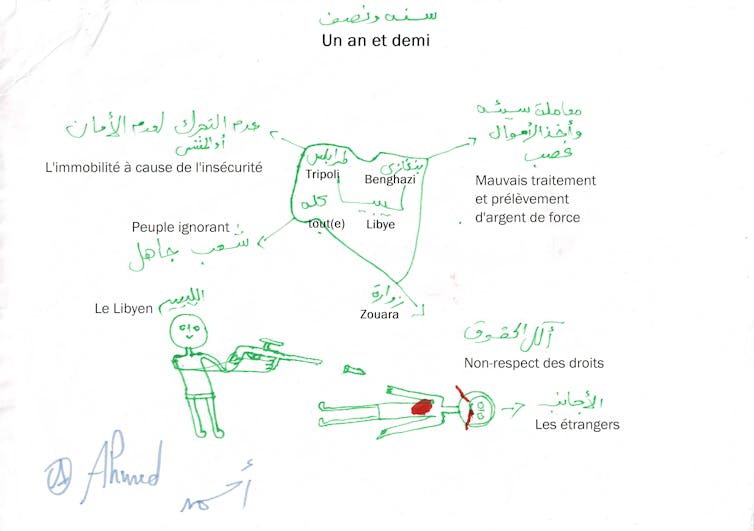 Sur sa carte, Ahmed, originaire de Syrie, dépeint « l’insécurité » à Tripoli, « les mauvais traitements et le prélèvement d’argent de force » à Benghazi, « le non-respect des droits » à Zouara.
