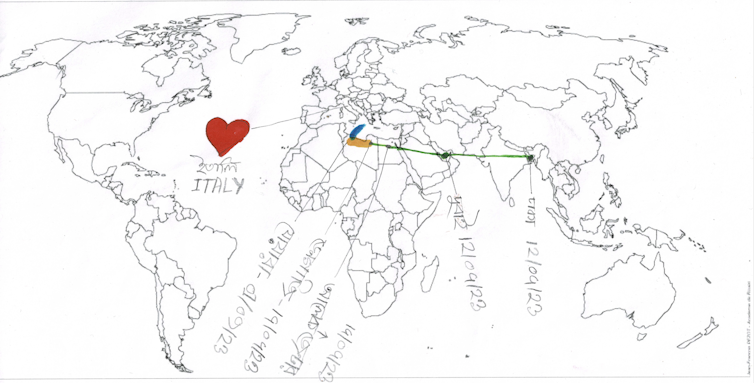 Vingt-et-une esquisses individuelles ont été fabriquées sur l’Ocean Viking (OV) au cours de ces recherches. Elles racontent des fragments de voyages, trajectoires plus ou moins fluides ou heurtées depuis le Bangladesh, le Pakistan, la Syrie, la Palestine et l’Égypte. Les parcours sont parfois très onéreux, mais rapides et organisés, comme ceux de certaines personnes bangladaises de Dacca à Zouara (Libye), en passant par Dubaï, en seulement quelques jours. D’autres s’étendent et se tissent sur plusieurs années, s’adaptant aux rencontres, aux ressources, aux dangers, et aux multiples guerres et violences dans les pays traversés.