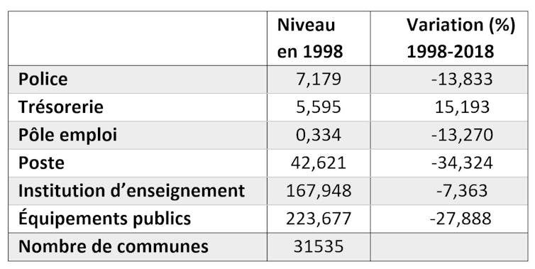 Les chiffres sont assez éloquents. Comme le montre le tableau 1, entre 1998 et 2018, la présence des services publics en matière d’écoles primaires et maternelles a reculé en moyenne de 7,36 %. Cette baisse concerne en premier lieu les établissements scolaires du primaire, et ce principalement dans les communes de petite et moyenne taille. Les bureaux de poste ont également été durement touchés, ainsi que les services de police et de gendarmerie.