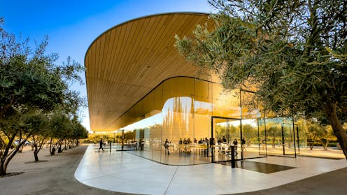Une vue d’Apple Park, siège social d’Apple, à Cupertino en Californie. La Silicon Valley, avec ses mondes virtuels et ses réseaux sociaux, incarne parfaitement cette tendance de notre époque à « l’hypervirtualisation ». (James Genchi/Unsplash), CC BY-NC