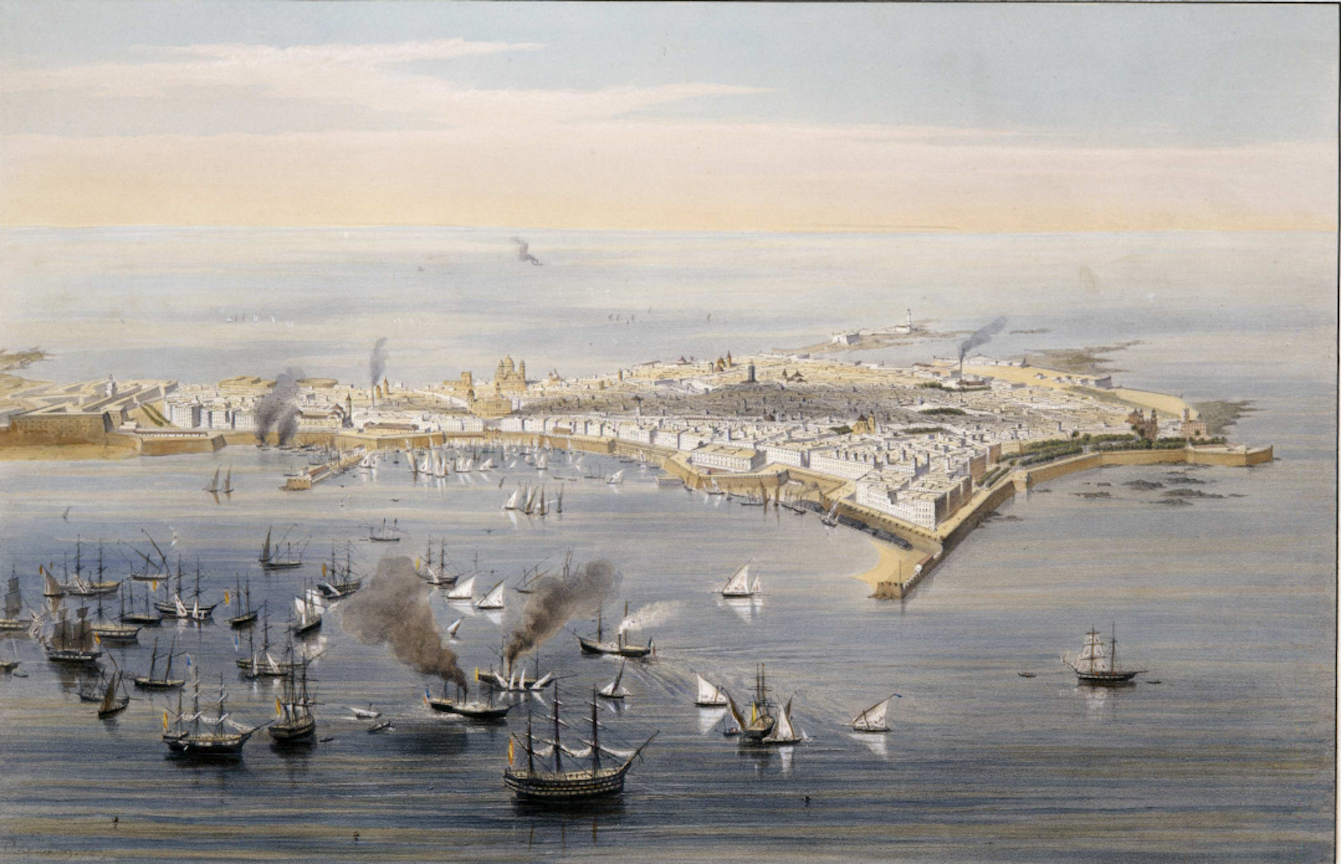 Vista de Cádiz desde el puerto dibujada por Alfred Guesdon en el siglo XIX. Biblioteca Digital Hispánica, CC BY