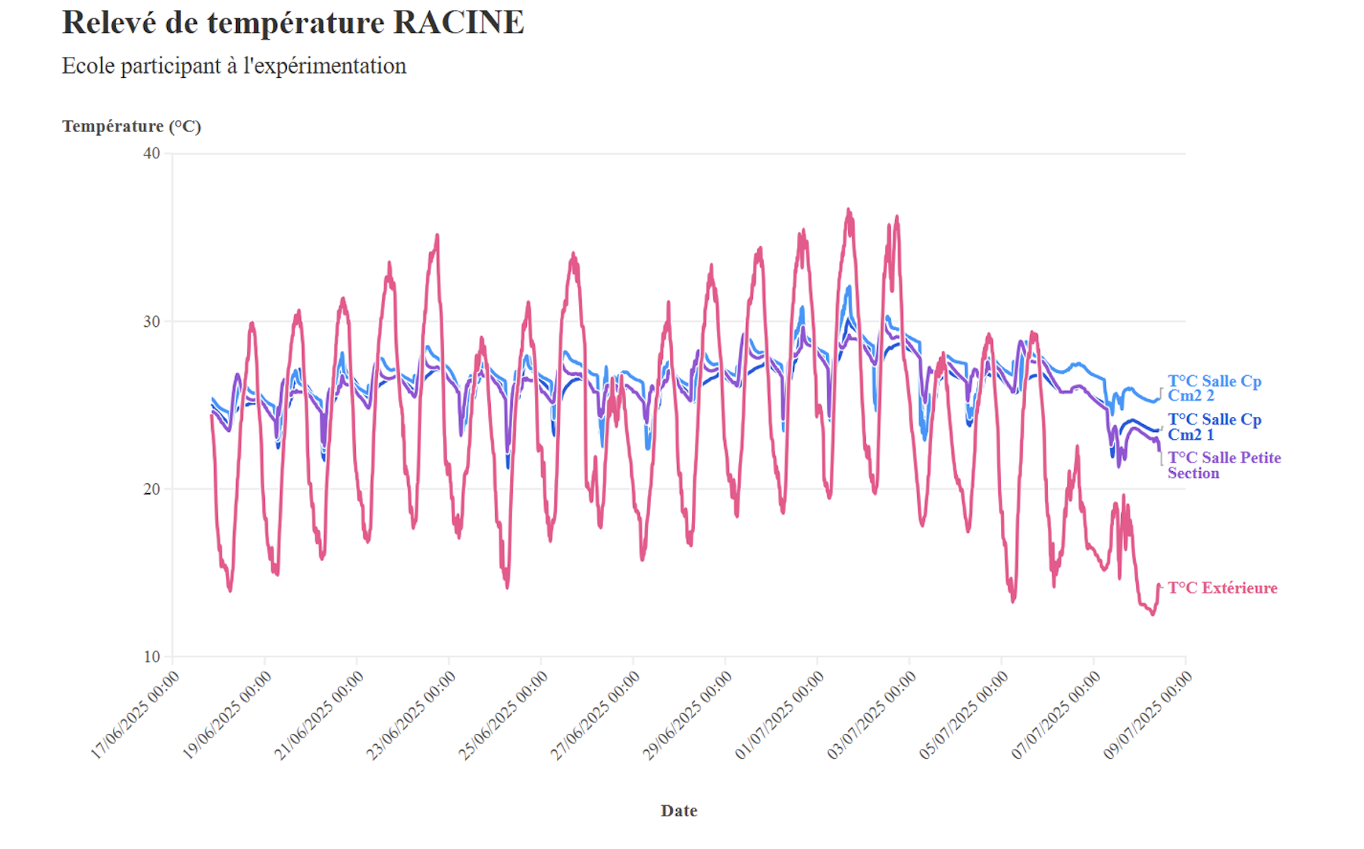 Les quinze écoles pilotes participant à l’expérimentation ont été équipées de capteurs (thermiques et hygrométriques) au début de l’été, permettant notamment de confirmer l’importance de la ventilation nocturne des écoles. Sur ce graphique, nous pouvons voir l’évolution des températures des salles de classe d’une des écoles sur toute la durée de la canicule de juin 2025 et de les comparer avec l’évolution de la température extérieure. Alors que cette dernière descend assez bas au cœur de la nuit, même au cœur de la canicule, celles des salles de classe ne descendent que très peu, car elles ne sont pas ventilées.
