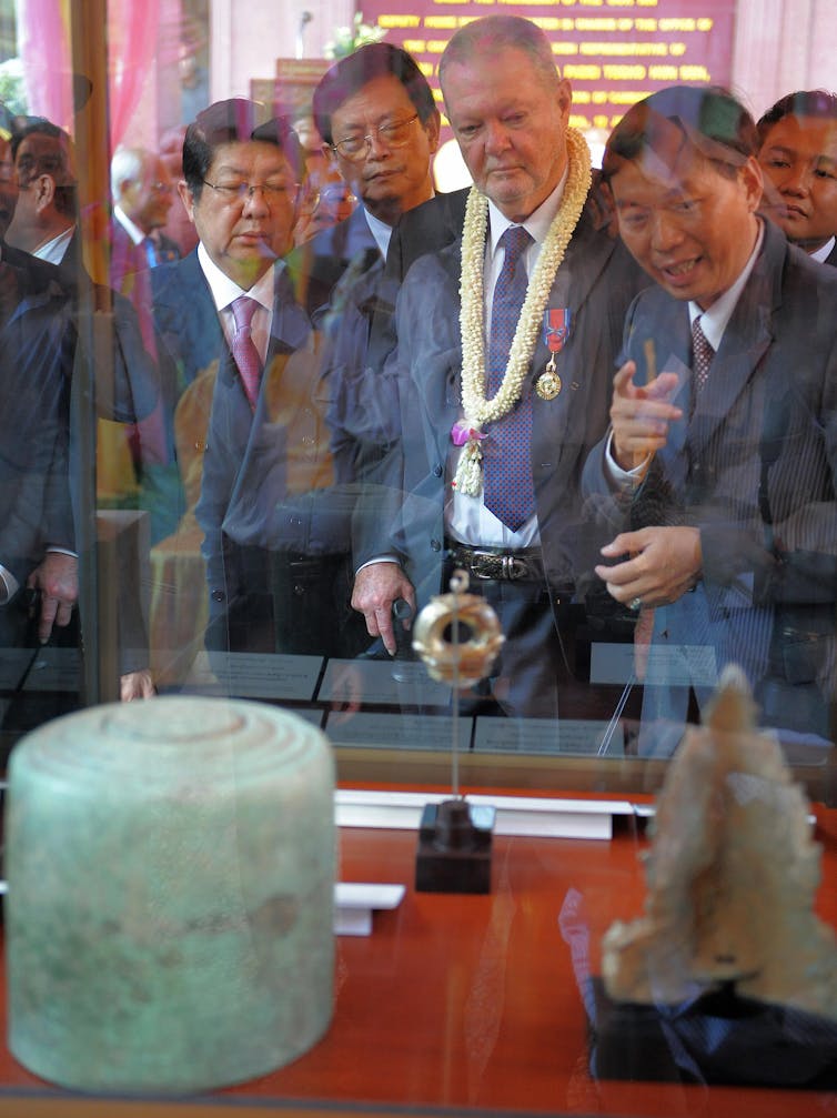 A revealing 2009 photograph shows Douglas Latchford, the antiquities dealer who sold the statues to the NGA, examining artefacts at the National Museum of Cambodia, alongside Sok An, the then-deputy prime minister of the Cambodian People’s Party. Latchford is wearing a medal signifying Cambodian knighthood, suggesting a collaborative relationship.
