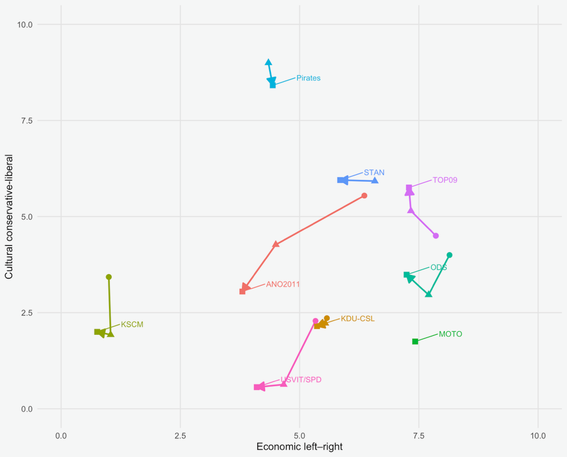La figure 2 (données du Chapel Hill Expert Survey) montre combien les attitudes culturelles sont liées aux positions sur la démocratie, et illustre la fracture entre ANO et ses alliés potentiels d’un côté, et les partis du gouvernement sortant et les Pirates de l’autre.
