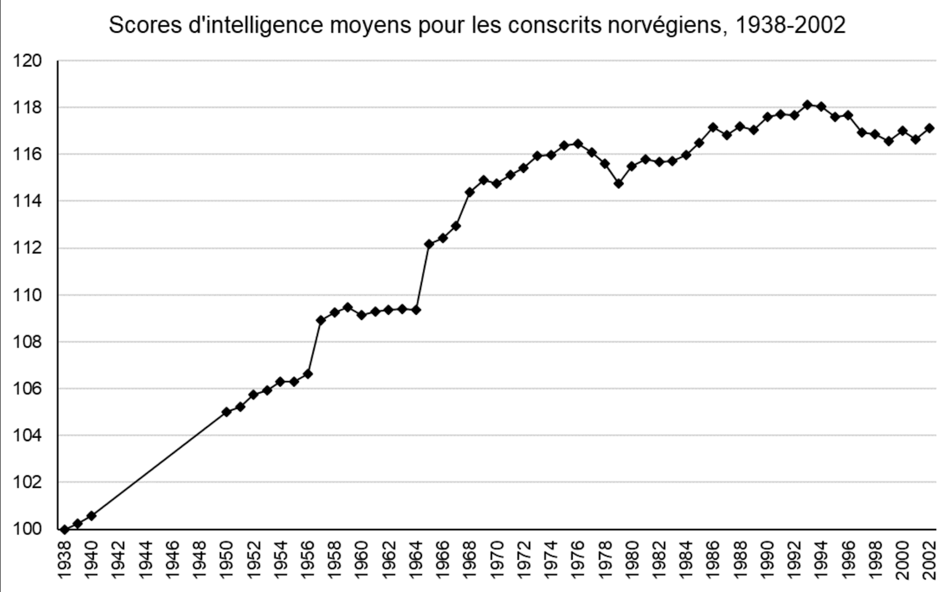 Que notre effet Flynn ralentisse ou s’interrompe, rien d’étonnant : la scolarisation et les qualités de notre système sanitaire ne progressent plus à grande vitesse. Mais un déclin de l’intelligence ? De petites baisses sont bien retrouvées par une poignée d’études, mais elles sont sans commune mesure avec les gains du XXe siècle. L’exemple de la Norvège (Figure 1) est frappant : ces données de grande qualité (jusqu’au début du XXIe siècle, la Norvège a évalué l’intelligence de l’ensemble de sa population masculine dans le cadre du service militaire obligatoire) montrent bien une petite diminution dans les années 2000, mais elle tient plus de la fluctuation aléatoire.