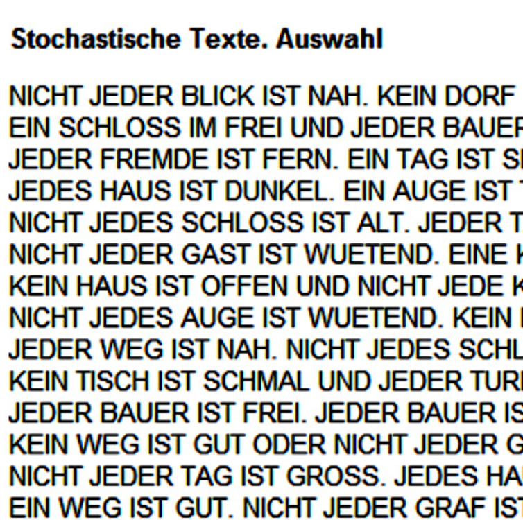 Poco después de aquellas cartas de amor automáticas, el filósofo y poeta alemán Max Bense animó al informático Theo Lutz a desarrollar un programa capaz de generar versos a partir de cálculos probabilísticos, al que llamaron Stochastische Texte(“Textos estocásticos”, 1959).