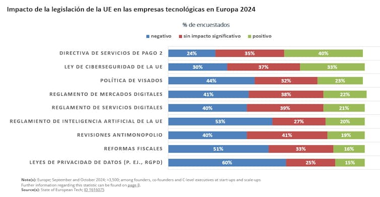 En una encuesta de 2024 a fundadores y directivos de startups y scaleups europeas, el 60 % señaló que las normas de la UE sobre privacidad de datos tienen un impacto negativo en la creación y el crecimiento de empresas tecnológicas en Europa. En el mismo estudio, el 53 % también mencionó el impacto del nuevo Reglamento de Inteligencia Artificial (AI Act).