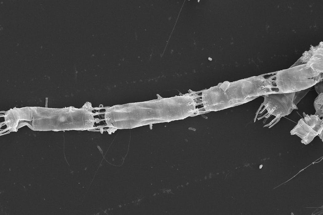 Fotografía a microscopía electrónica de barrido de una cadena de células de la especie de diatomea céntrica _Skeletonema pseudocostatum_ aislada en la bahía de Cádiz. Juan Rodríguez-Márquez y Ana Bartual.