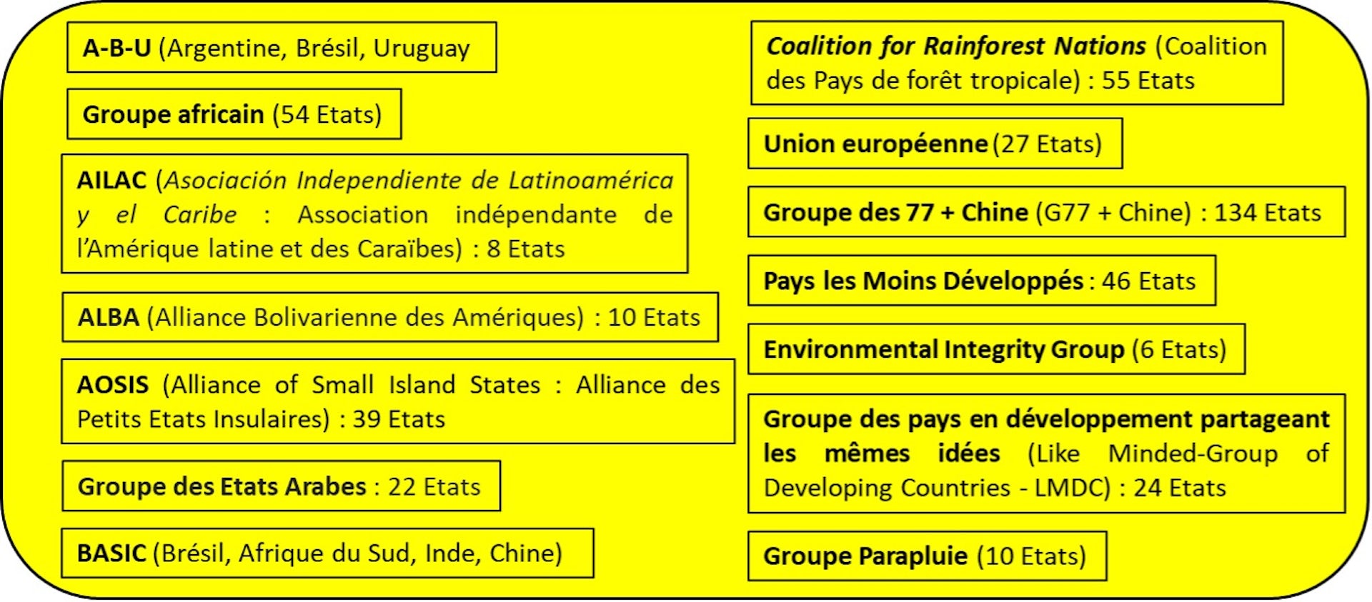 Plusieurs États sont ainsi membres de plusieurs coalitions à la fois, suivant leurs enjeux et intérêts par rapport aux changements climatiques et à leurs niveaux de développement économique et social. Par exemple, la Chine, l’Inde et le Brésil sont membres de quatre coalitions, les Comores sont membres de six coalitions, et le Soudan est membre de six coalitions.
