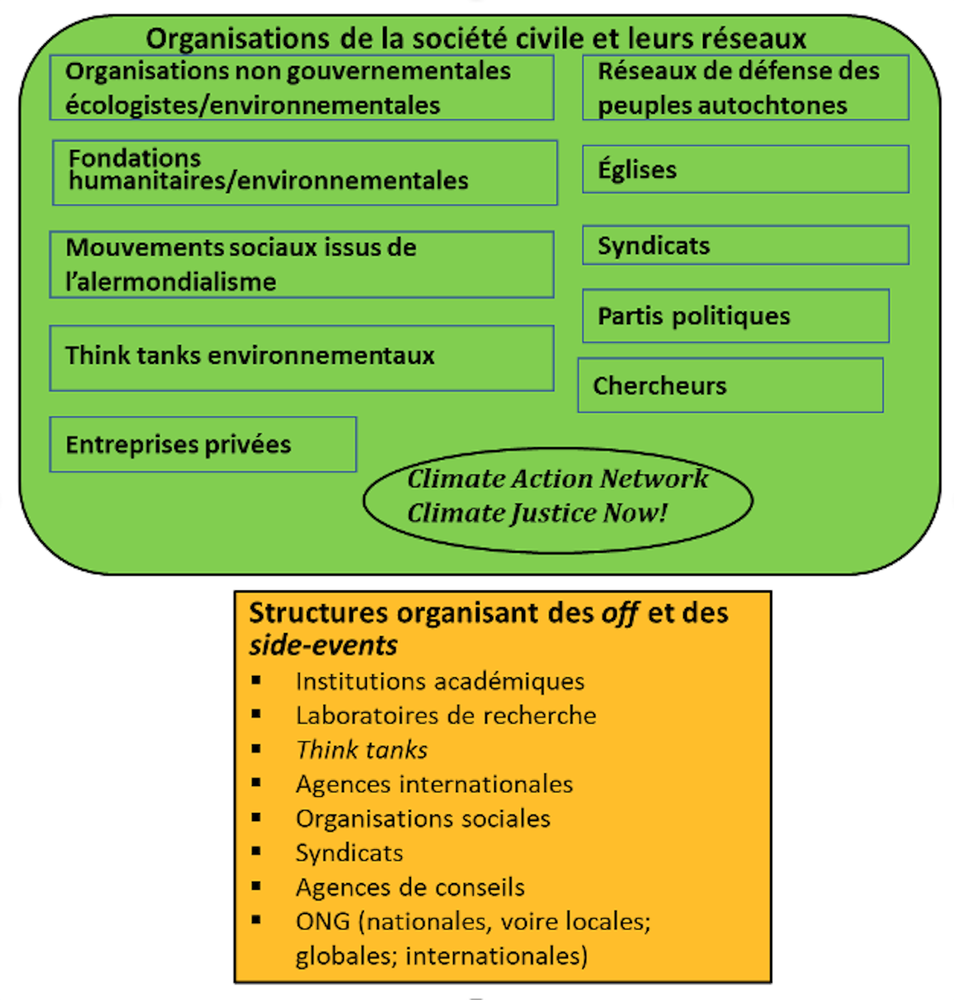 Si les États sont au cœur des COP, ils ne sont pas pour autant les seuls acteurs. Les organisations de la société civile (OSC) ont pris une place considérable dans les négociations, soit aux côtés des États, soit en constituant leurs propres arènes, subsidiaires aux négociations officielles.