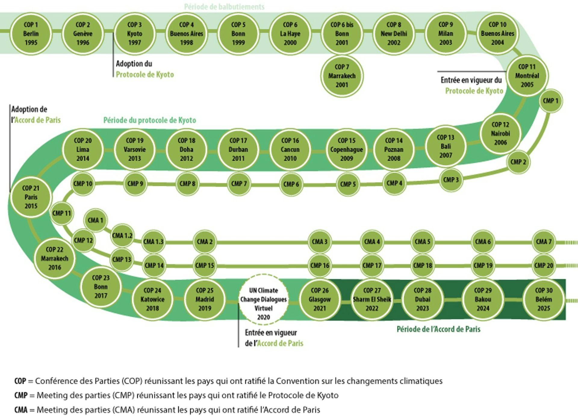 Depuis la première COP en 1995, le paysage des négociations climatiques s’est complexifié : au format initial s’est ajoutée une deuxième arène avec l’entrée en vigueur du protocole de Kyoto (CMP) en 1997, puis une troisième avec l’accord de Paris (CMA) en 2015, chacune réunissant les États ayant ratifié ces accords.