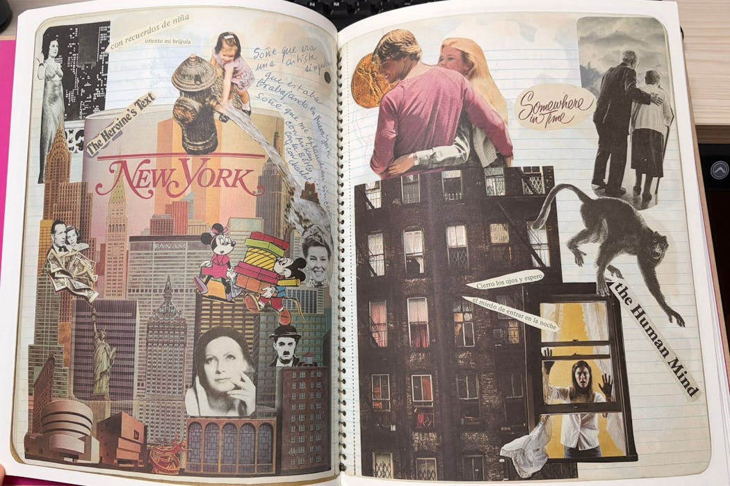 Los collages, que incorporan recortes de periódicos, revistas y fotografías de la ciudad, fueron realizados a lo largo de aquellos meses de estancia en Nueva York en un cuaderno personal. Al descubrir sus páginas captamos el dinamismo urbano, la superposición de voces y estímulos visuales que la autora percibía como un flujo incesante de imágenes. Entre anuncios publicitarios, encontramos a Mickey Mouse o Charlie Chaplin, Humphrey Bogart y Lauren Bacall junto a un puñado de dólares y una niña que juega con una boca de riego y deja salir un gran chorro de agua. Acompañando la escena, unas palabras manuscritas: