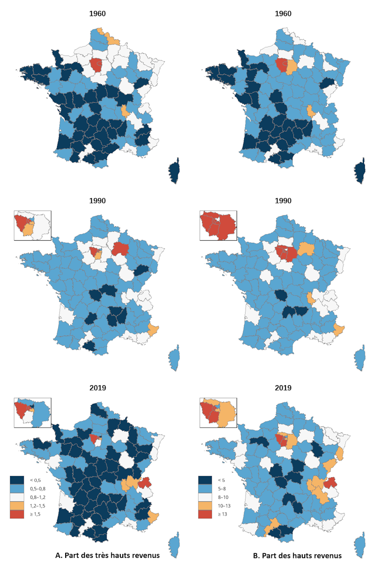 En 2019, la rupture est manifeste. Les très hauts revenus sont absents dans la plupart des départements de la « diagonale du vide », tandis que la France des très hauts revenus se réduit à quelques pôles métropolitains (Bordeaux, Nantes, Toulouse, Marseille, Dijon, Strasbourg, Nice) qui conservent des parts proches de 1 % et à la frontière suisse où elle est de 2 % en Haute-Savoie. En Île-de-France, la polarisation atteint des sommets : la part des très hauts revenus est seulement de 0,4 % en Seine-Saint-Denis, mais de 4,5 % à Paris, 4,2 % dans les Hauts-de-Seine, et 2,8 % dans les Yvelines.