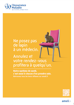 L’affiche des « lapins posés aux rendez-vous médicaux » est un exemple très parlant de ce type de processus. Cette campagne de sensibilisation à la gestion du parcours de soin transforme un problème systémique en faute individuelle, à travers un dispositif graphique, langagier ainsi que moral, politiquement et économiquement pensé.