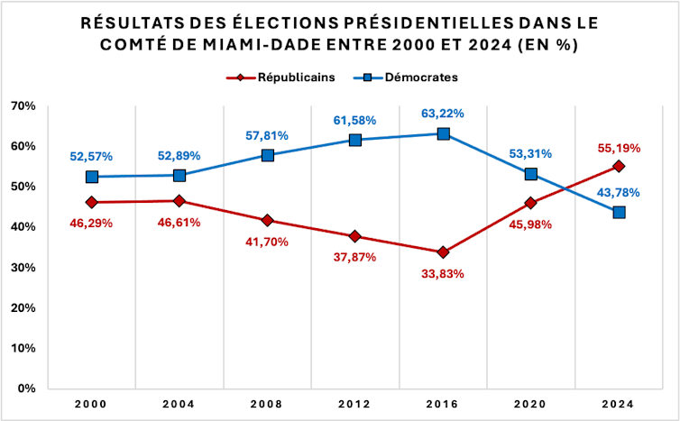 Ce basculement s’explique notamment par la mobilisation en faveur de Trump d’une partie des membres des communautés hispaniques – spécialement les communautés cubaine, vénézuélienne et nicaraguayenne – sensibles à sa rhétorique antisocialiste. En liant la politique étrangère, l’immigration et l’identité politique, les républicains (Republican Party) ont construit un récit particulièrement efficace à Miami. Guillermo Grenier, professeur à la Florida International University et spécialiste de la communauté cubaine, résume ainsi cette dynamique :