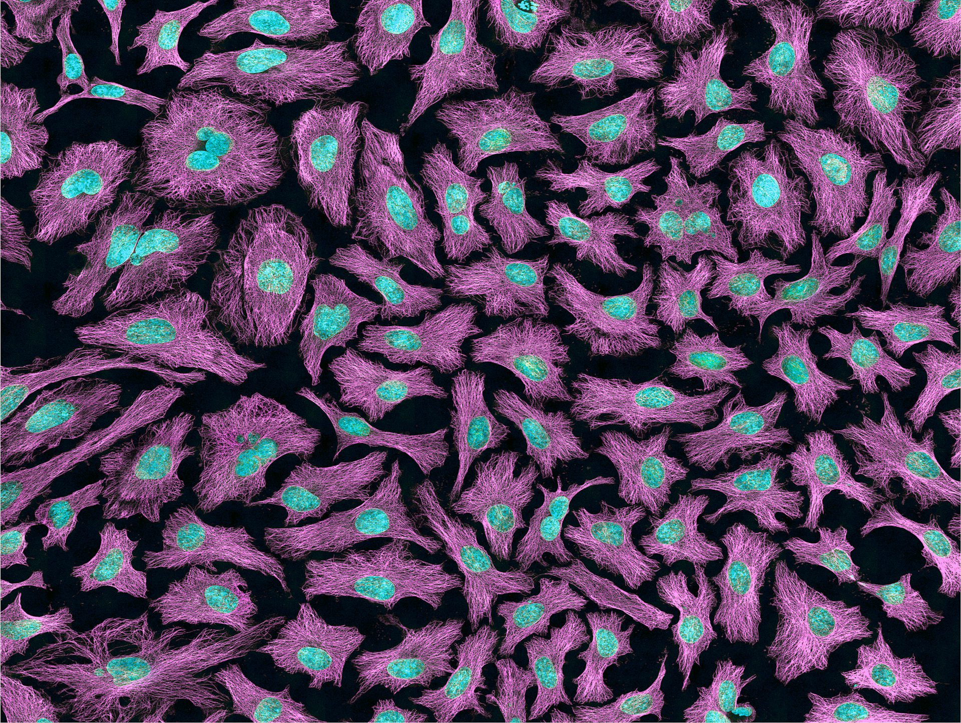 HeLa est une lignée de cellules humaines issue d’un cancer du col de l’utérus. Ce sont des cellules épithéliales, semblables à celles qui tapissent normalement la surface des organes ou des muqueuses, à la manière d’un carrelage serré. En culture, elles forment un « tapis » plutôt régulier, se divisent très vite et tolèrent les manipulations répétées.