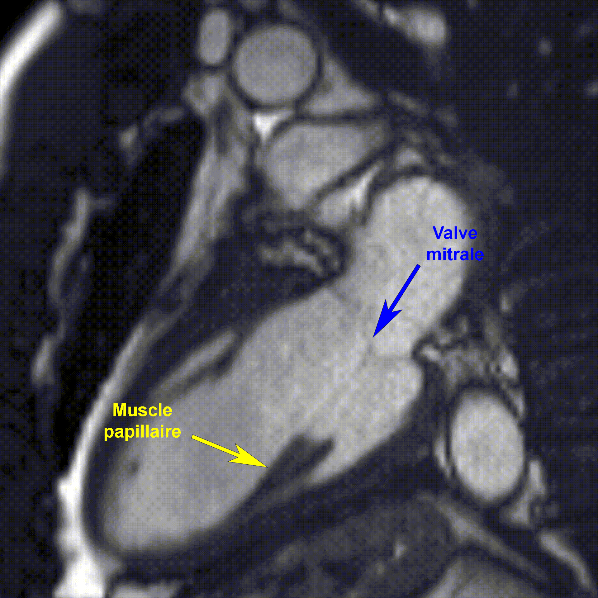 Gif animé du cycle cardiaque du ventricule gauche ; le rythme cardiaque a été ralenti, afin d’avoir le temps d’apprécier la mécanique existant entre le muscle papillaire (indiqué par une flèche jaune) et la valve mitrale (flèche bleue).