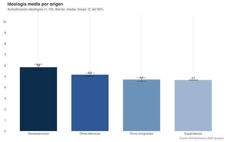 Los datos indican, por tanto, que los venezolanos residentes en España se sitúan, en promedio, más a la derecha que la población española, aunque su posicionamiento se mantiene próximo al centro y no responde a una ideología cerrada.