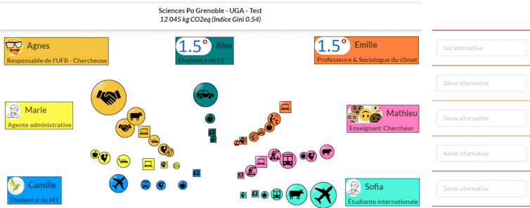 Interface Ma Terre (adaptée à Sciences Po Grenoble-UGA), phase de négociation autour des « empreintes carbone » des personnages. La surface de chaque jeton est proportionnelle à l’empreinte carbone. La couleur et le logo du jeton décrivent son porteur et l’activité, respectivement. Les jetons donnant lieu à des alternatives sont reportés à droite.