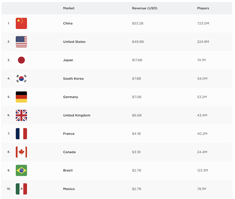 Si en 2016, les États-Unis étaient en tête avec des revenus de 46,4 milliards de dollars devant la Chine (44 milliards) et le Japon (19 milliards), la situation a changé avec l’explosion du nombre de joueurs. En raison de sa population importante, la Chine est passée en tête, creusant l’écart entre elle et les autres pays. Néanmoins, la population ne fait pas tout : l’Inde, par exemple, ne figure pas dans le Top 10.