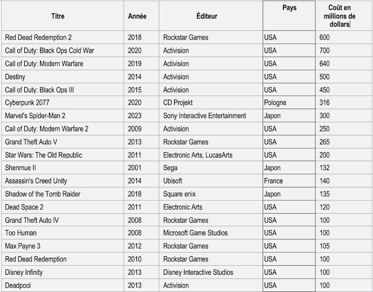 Les jeux classés AAA (terme pour désigner l’équivalent d’un « blockbuster ») demandent plusieurs années de développement et leur coût peut représenter jusqu’à plusieurs centaines de millions de dollars (certains jeux ont coûté plus cher à produire que des films comme Avatar, ou Pirates des Caraïbes…). Le marché est dominé par les États-Unis, et la Chine n’apparaît pas dans la liste ci-dessus.