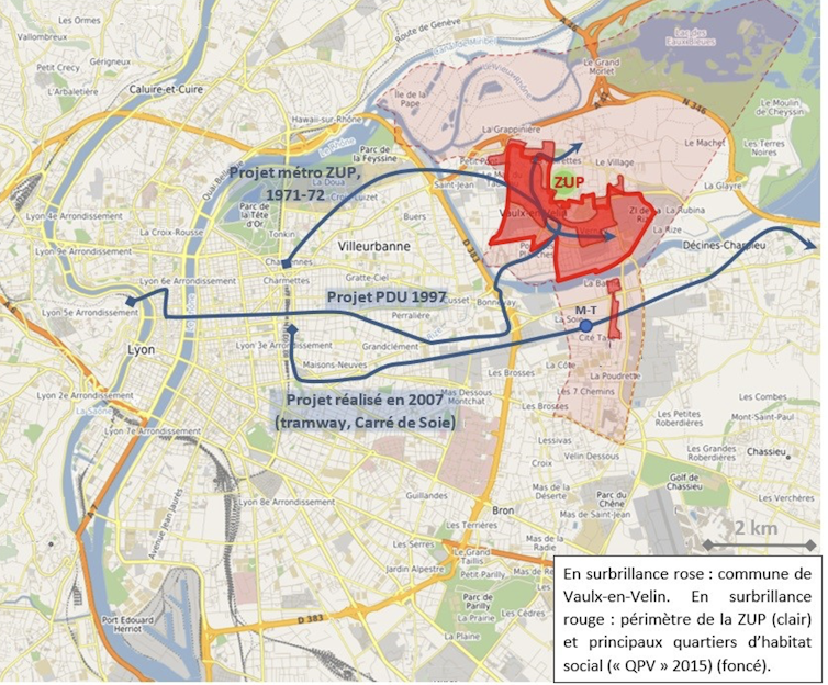 À Vaulx-en-Velin, les projets de desserte des grands ensembles incarnent bien les effets de ces nouvelles grilles de lecture. Ces projets sont progressivement abandonnés ou redéfinis, tandis que les investissements se concentrent sur d’autres secteurs jugés plus stratégiques et attractifs. Résultat : lorsque le métro et le tramway arrivent finalement à Vaulx-en-Velin, à la fin des années 2000, ils contournent les quartiers d’habitat social les plus peuplés pour desservir un nouveau quartier aux fonctions économiques métropolitaines et avec des logements moins accessibles.