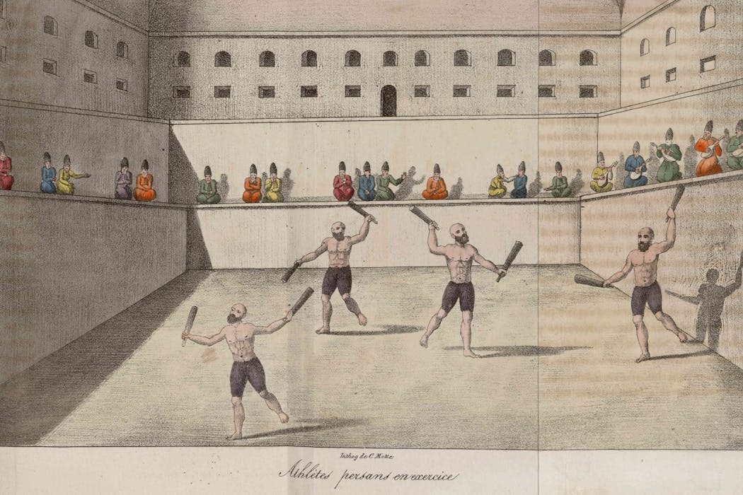 De l’Afrique du Nord à l’Asie centrale, des Balkans jusqu’aux confins de l’Inde, les lutteurs vont former des confréries régies par un officiel de la cour et s’entraîner dans des gymnases traditionnels appelés zurkhâneh (littéralement, maisons de la force). Bien que leur origine reste difficile à retracer, leur existence remonterait à l’empire achéménide où leur fonction principale était d’assurer la consolidation des réseaux militaires, et plus tard la résistance de ces derniers face aux multiples incursions ennemies. Dans la littérature française, l’existence de ces gymnases n’est attestée qu’à partir du XVIIe siècle dans deux récits de voyages : Estat de la Perse en 1660 du père Raphaël du Mans, de son vrai nom Jacques Duterte, traducteur auprès des rois safavides et moine capucin responsable d’un couvent à Ispahan de 1647 à sa mort en 1669 ; et celui du chevalier Jean Chardin (1643-1713), explorateur et auteur du Journal de voyage du chevalier Chardin en Perse et aux Indes orientales.