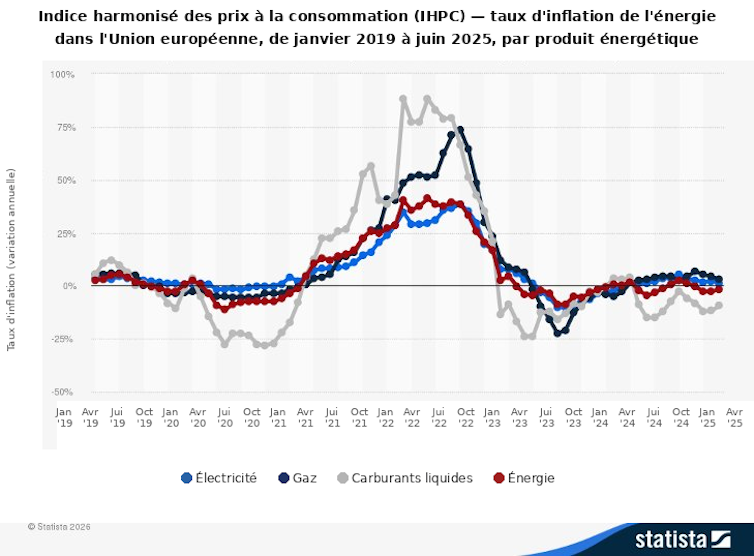 Figure 1 : Taux d’inflation des prix de l’énergie dans l’Union européenne entre 2019 et 2025, par produit.
