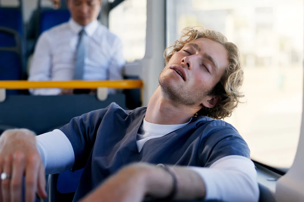 Hombre dormido en el autobús. PeopleImages/Shutterstock
