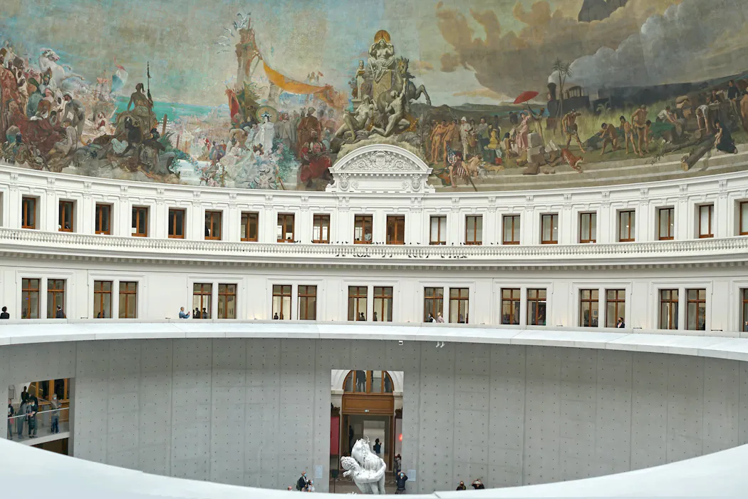 Tel un immense œil de fonte et de verre, le dôme filtre la lumière qui baigne le hall circulaire de la Bourse de commerce de Paris. Il anime d’un faisceau d’ombres la grande peinture murale qui orne la partie inférieure de la coupole, et d’un jeu de reflets les vitrines, elles aussi d’origine, qui scandent le pourtour du hall.