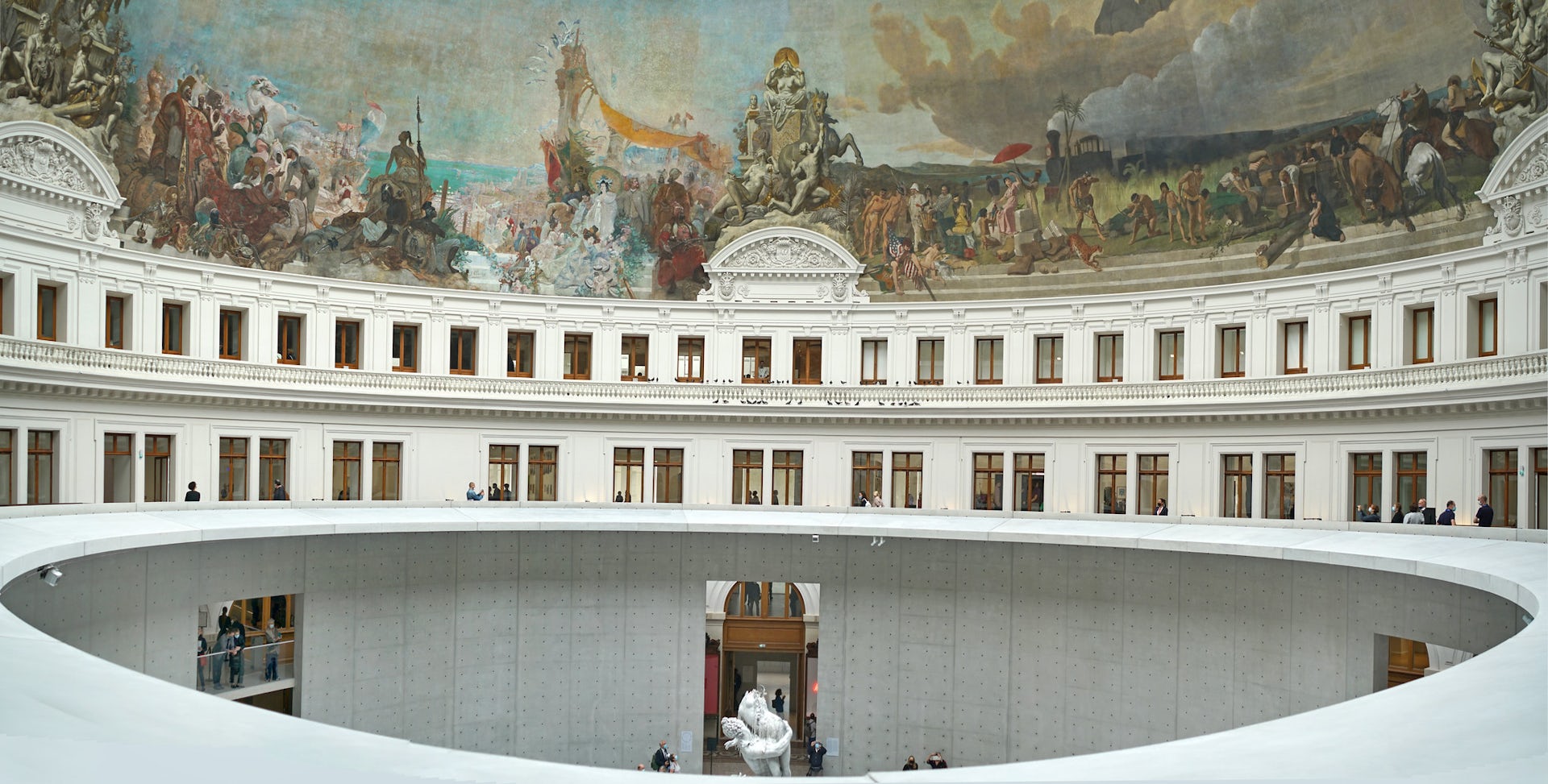 Tel un immense œil de fonte et de verre, le dôme filtre la lumière qui baigne le hall circulaire de la Bourse de commerce de Paris. Il anime d’un faisceau d’ombres la grande peinture murale qui orne la partie inférieure de la coupole, et d’un jeu de reflets les vitrines, elles aussi d’origine, qui scandent le pourtour du hall.