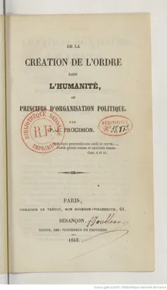 De la création de l’ordre dans l’humanité ou Principes d’organisation politique, 1843.