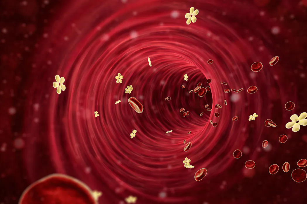 Representación de moléculas de insulina (con forma de flor) y glóbulos rojos en un vaso sanguíneo. UGREEN 3S/Shutterstock