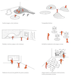 1. Emplear el color con intención estética y comunicativa para delimitar zonas, activar comportamientos (juego, calma, tránsito) o sugerir usos del espacio sin necesidad de incorporar elementos físicos. Tonos desaturados y formas orgánicas para zonas de descanso o circuitos de líneas geométricas en colores saturados para invitar al movimiento o proponer espacios de juego.