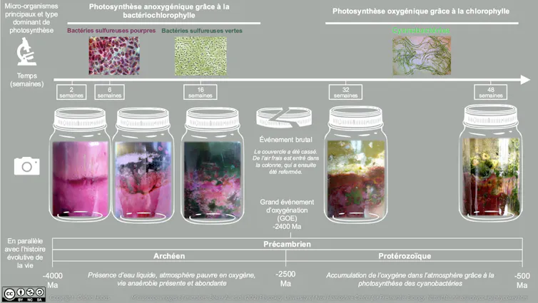 Illustration des changements observés dans une colonne de Winogradsky installée à la station marine de Concarneau (Finistère). La colonne a été réalisée à partir de vase prélevée dans les viviers de la station. Les deux tiers de la colonne ont été remplis de vase, et le dernier tiers d’eau de mer provenant du site. Du carbone a été ajouté au fond de la colonne sous forme de petits morceaux de papier. L’objectif du projet est d’illustrer l’incroyable diversité des microorganismes et de proposer un parallèle entre les changements observés dans la colonne et certaines étapes de l’histoire évolutive de la vie sur Terre.