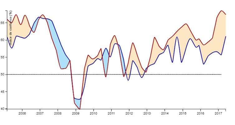 Aux États-Unis, ni les turpitudes du président Donald Trump ni les tensions avec la Corée du Nord ne semblent devoir influer significativement sur le climat des affaires. Celui-ci se maintient au-dessus de sa moyenne à 65,9 contre 67,4 au trimestre précédent. Ce niveau de confiance reste compatible avec une croissance élevée pour les trimestres à venir. Néanmoins l’effacement de l’écart entre les niveaux de confiance aux États-Unis et en Europe pourrait indiquer l’approche du point haut du cycle économique.