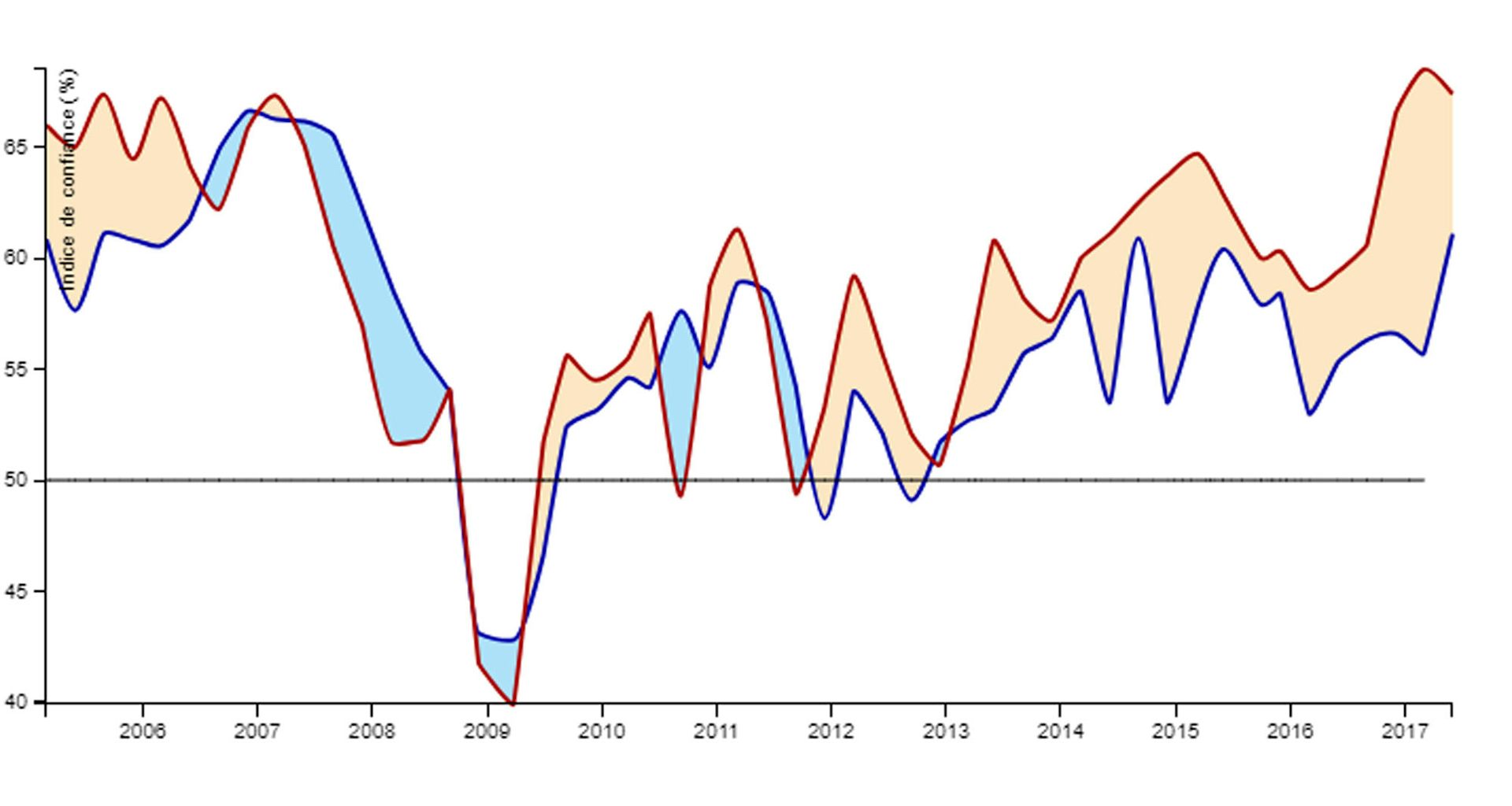 Aux États-Unis, ni les turpitudes du président Donald Trump ni les tensions avec la Corée du Nord ne semblent devoir influer significativement sur le climat des affaires. Celui-ci se maintient au-dessus de sa moyenne à 65,9 contre 67,4 au trimestre précédent. Ce niveau de confiance reste compatible avec une croissance élevée pour les trimestres à venir. Néanmoins l’effacement de l’écart entre les niveaux de confiance aux États-Unis et en Europe pourrait indiquer l’approche du point haut du cycle économique.