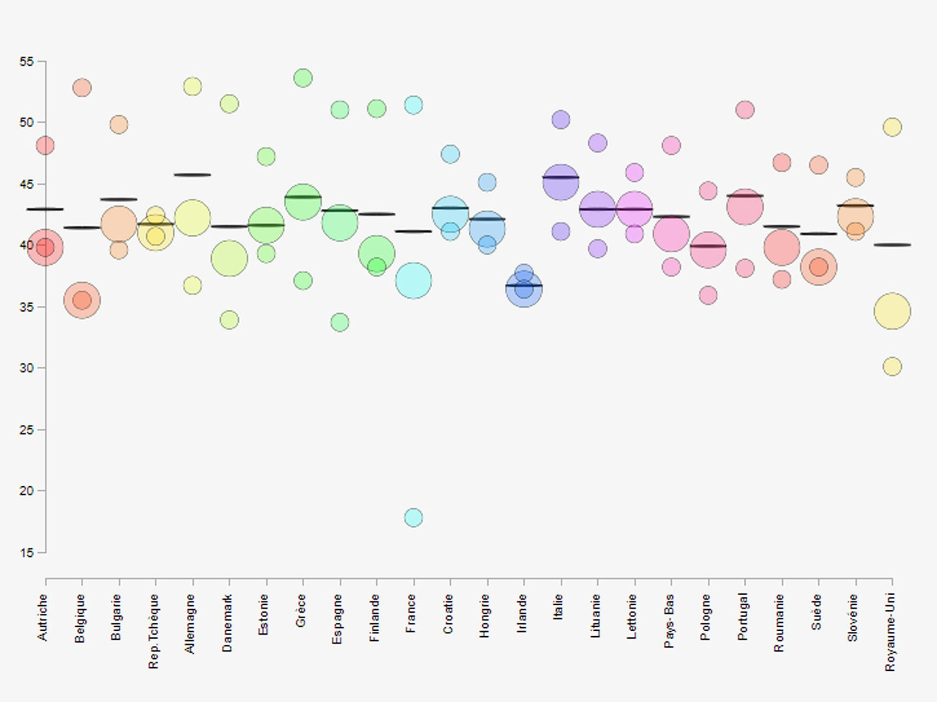 Âge médian de la population, par pays, Europe 2015. Les petits cercles figurent les régions les plus et les moins âgées du pays. Les régions capitales sont les grands cercles, le trait horizontal est la moyenne nationale. Philippe Roure/The Conversation France, CC BY