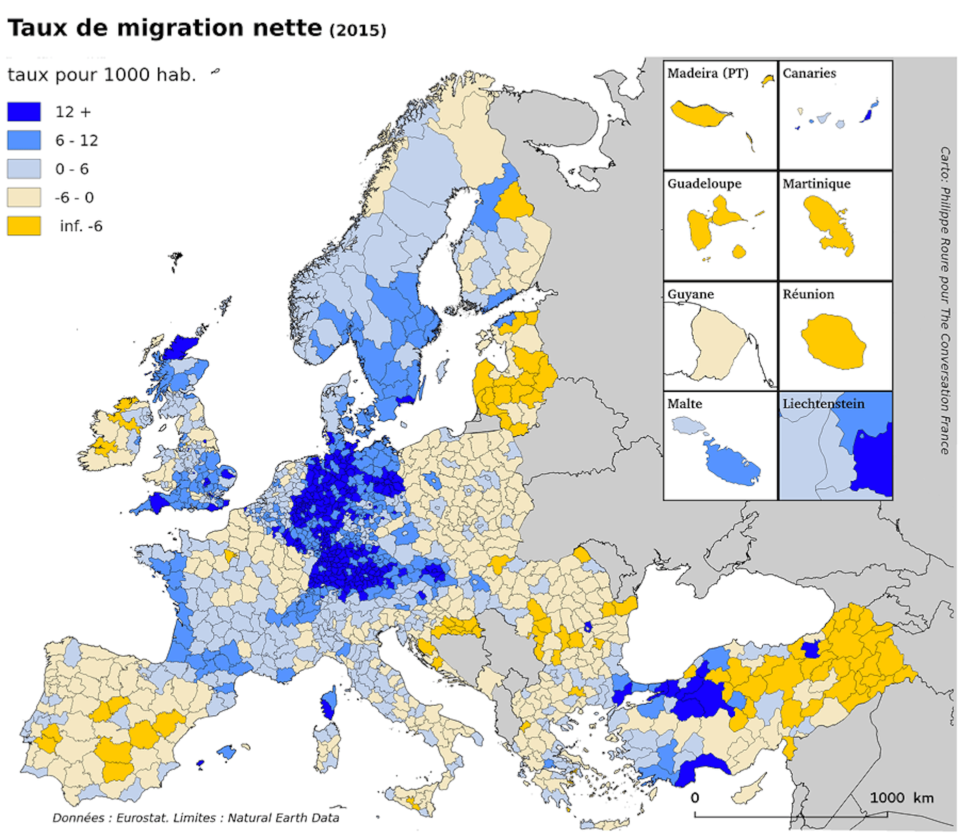 Taux de migrations nettes (bilan migratoire : entrées – sorties) en Europe, 2015. Philippe Roure/The Conversation France, CC BY