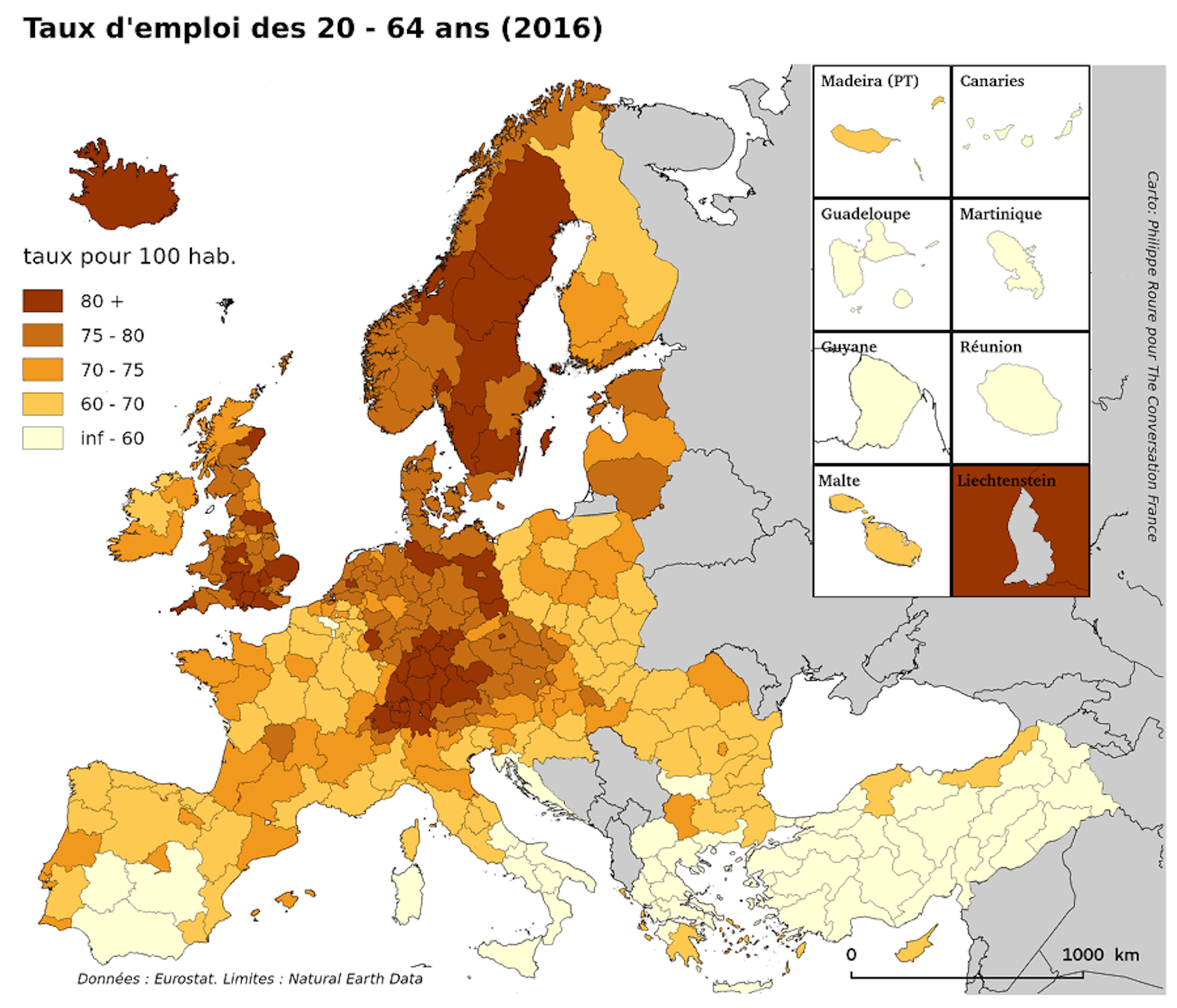 Taux d’emploi des 20-64 ans en Europe, 2015. Philippe Roure/The Conversation France, CC BY