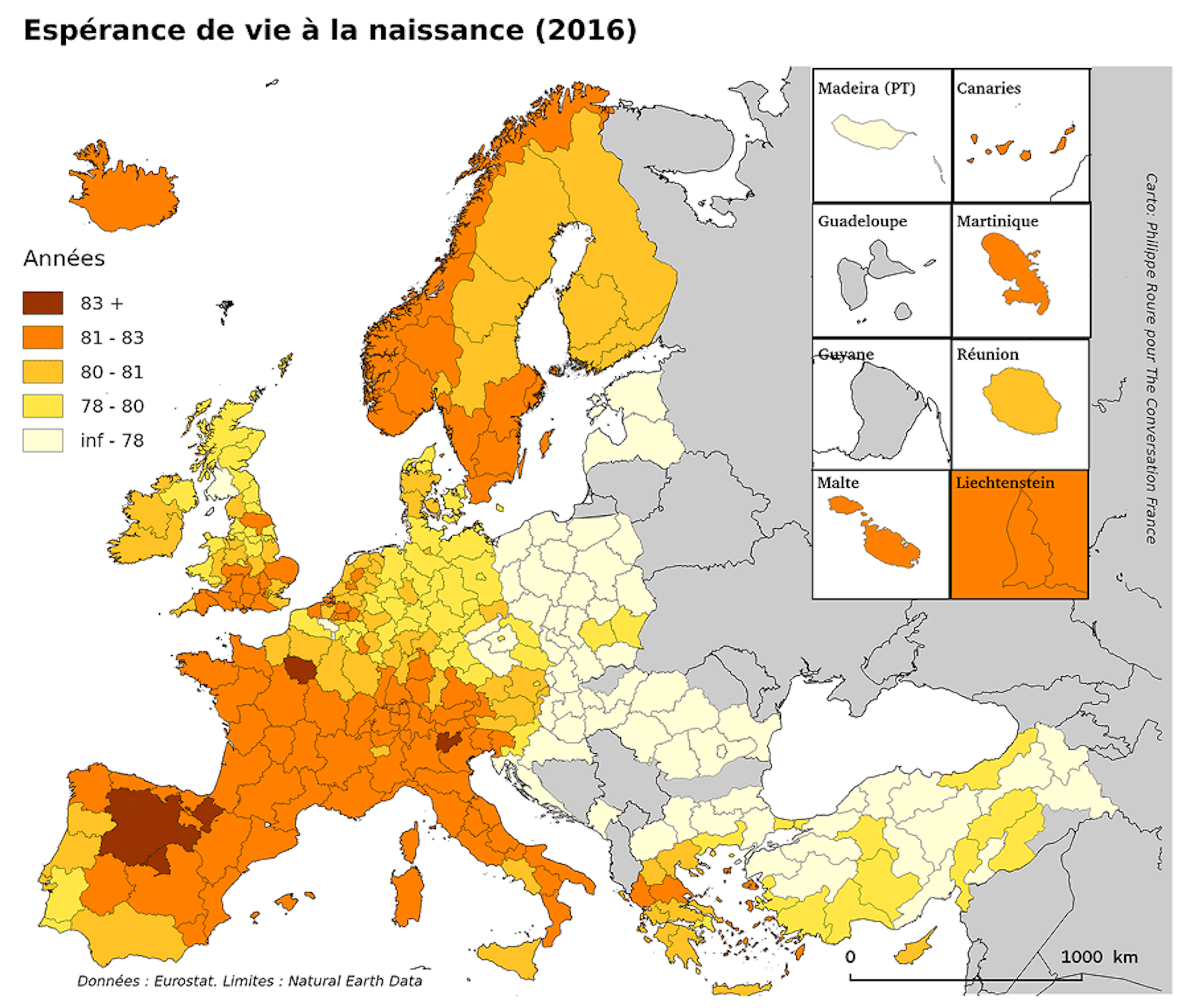Espérance de vie à la naissance en Europe, 2015. Philippe Roure/The Conversation France, CC BY