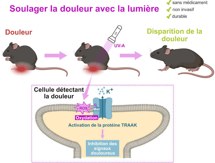 Allumer la lumière pour éteindre la douleur. Ce slogan résume bien notre découverte : une simple lumière dans l’UV-A supprime la douleur chez les rongeurs, sans aucun médicament et de manière plus efficace et durable que l’ibuprofène. Cette méthode, que nous avons appelée Light-Induced Analgesia, récemment publiée dans Nature Communications, le 26 janvier 2026, pourrait améliorer le bien-être animal et bouleverser les pratiques vétérinaires dans le cadre de l’expérimentation animale, mais aussi lors de la prise en charge des nouveaux animaux de compagnie, comme les hamsters, les chinchillas et même les tortues ou les boas.