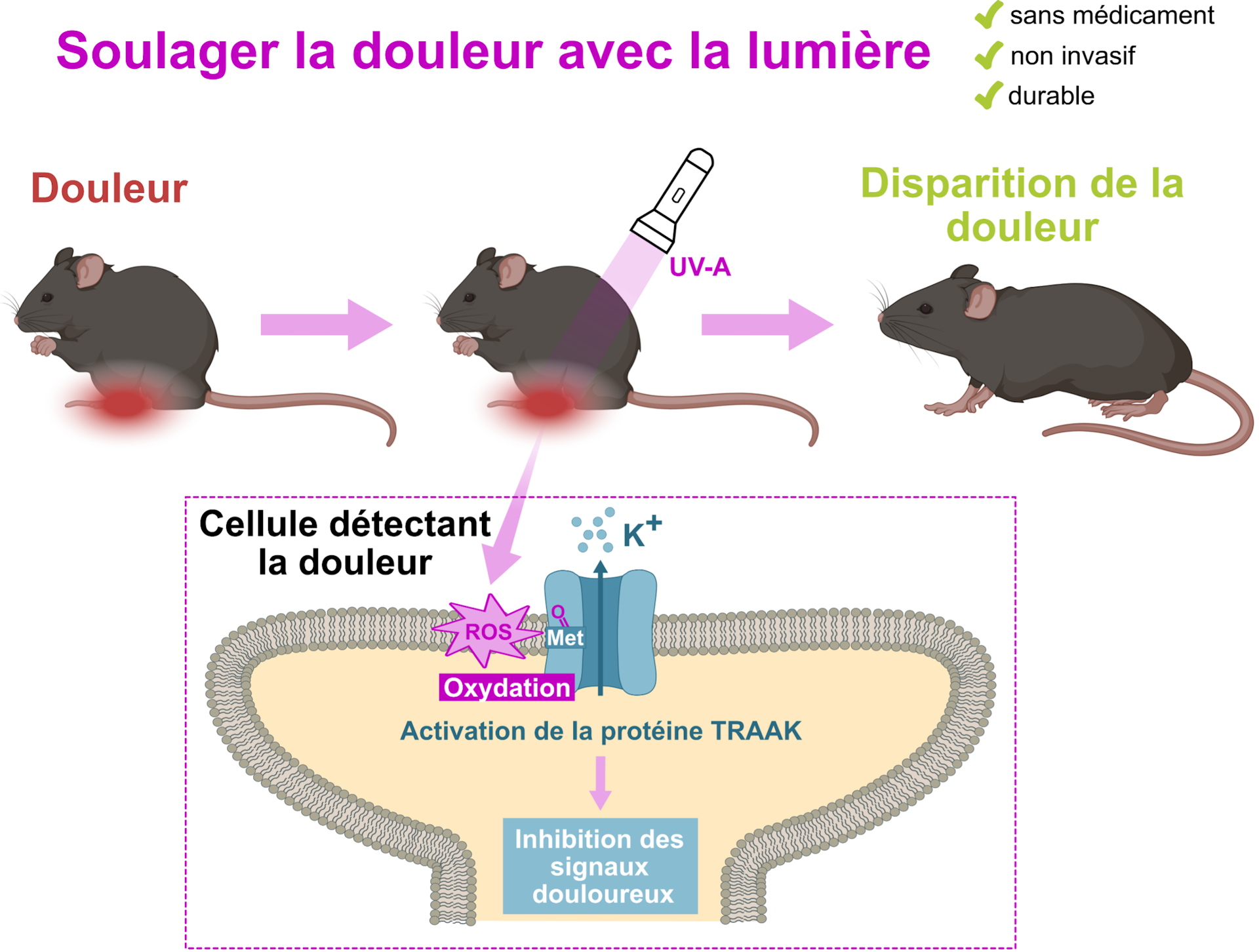 Analgésie induite par la lumière (LIA) : l’illumination de la peau de rongeurs avec une simple lampe UV-A (appelée lumière noire) active les canaux TRAAK présents dans les terminaisons nerveuses des récepteurs de la douleur situés dans la zone exposée. Cette activation inhibe l’activité de ces récepteurs, qui cessent alors de transmettre des signaux douloureux vers le cerveau. Ce processus génère un effet analgésique net et prolongé, observé aussi bien chez le rat que chez la souris.